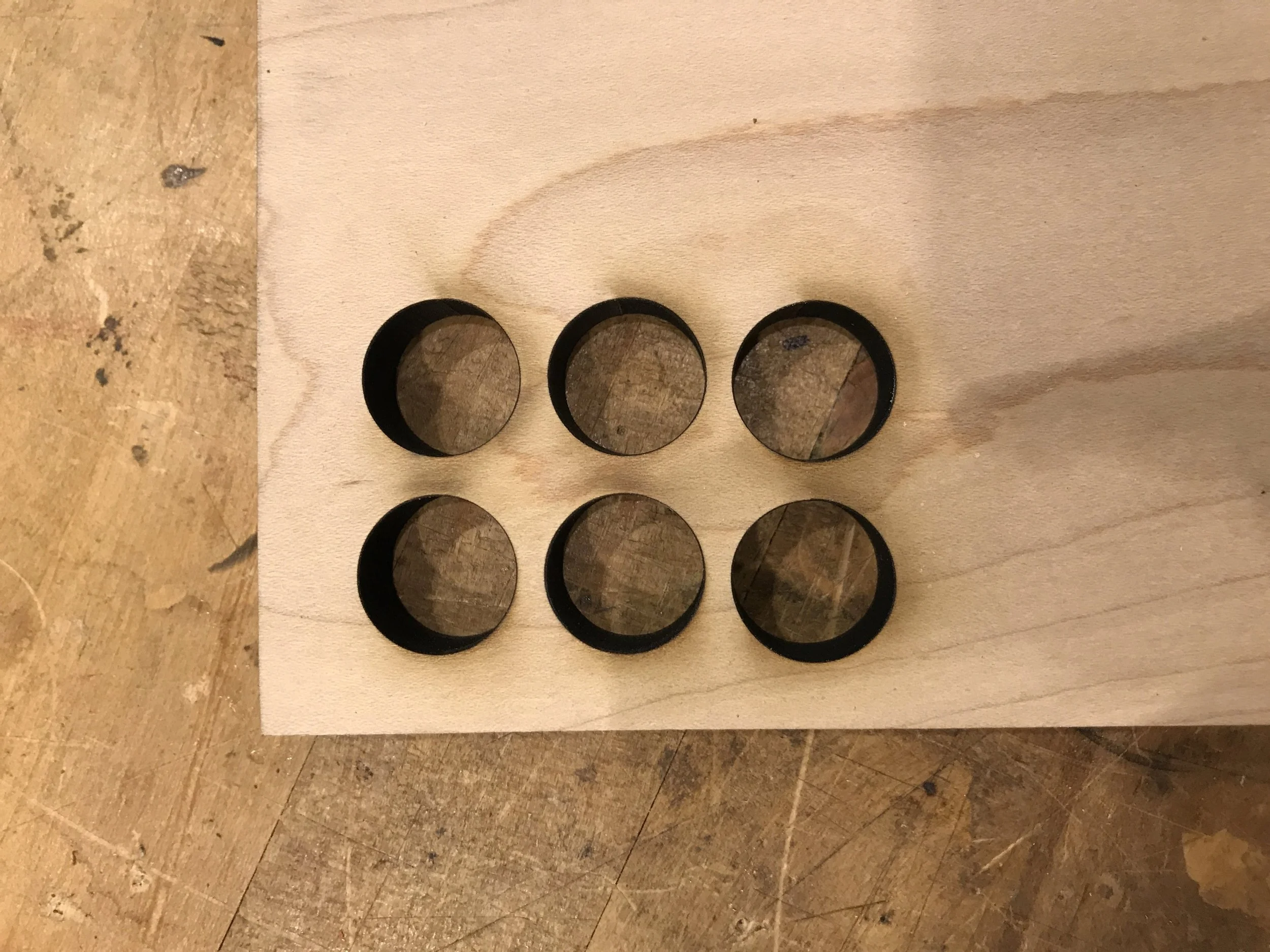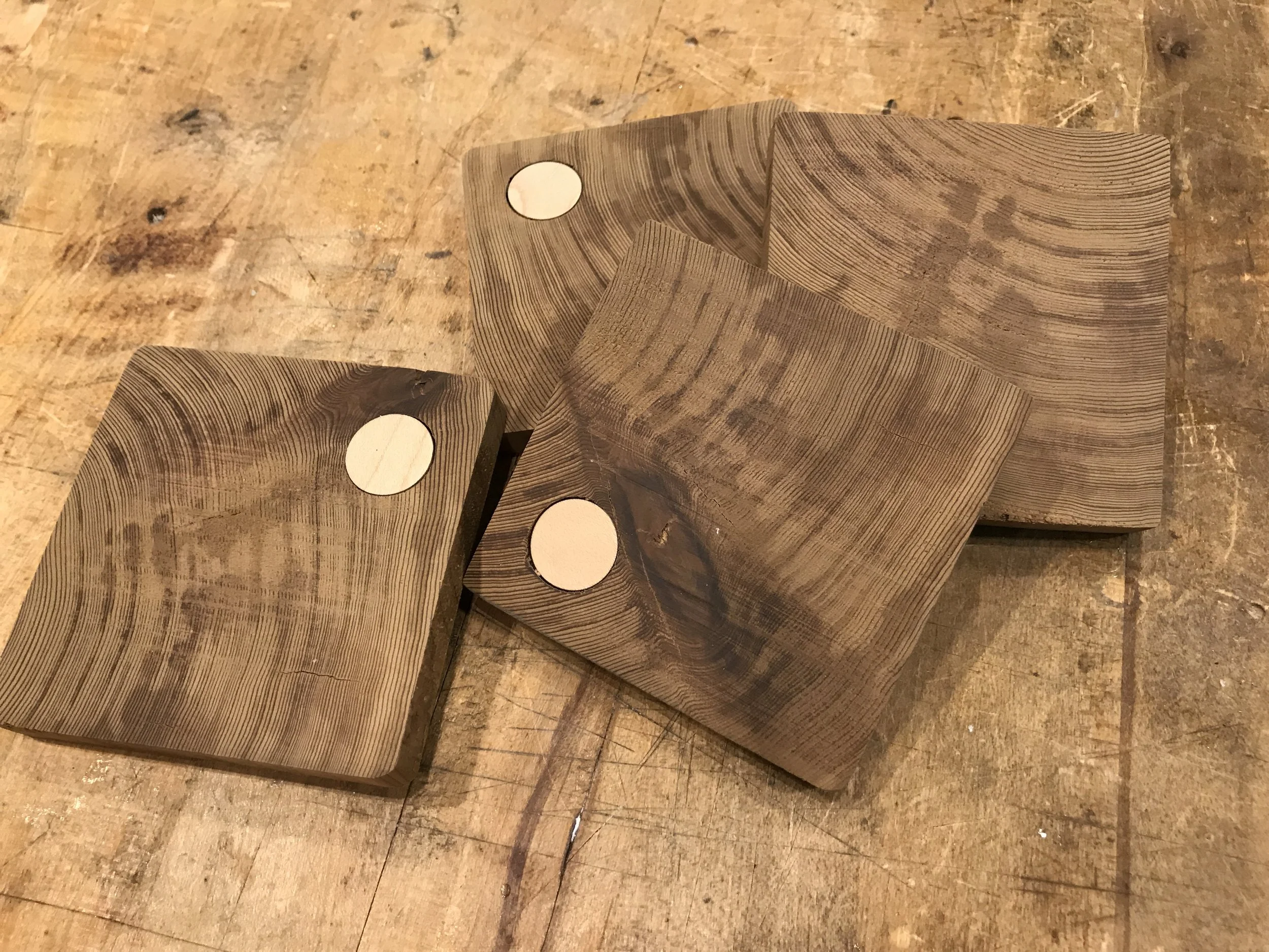 I had some scrap mahogany and hard maple at my disposal, and I wanted to build some color contrast so I used the mahogany for the coasters and the maple for the coaster holder (is that even a word?). In order to visually connect these components, I added little maple circular cuts and glued them an inlay located at one corner of each coaster. I also added a mahogany corner piece for the coaster holder for the same reason. I wanted to do most of them by hand but ended up cutting the maple circles using a laser cutter to be the exact cut I made on the coasters.