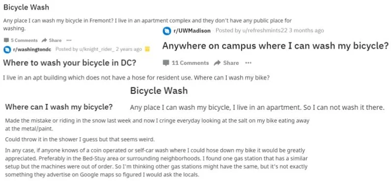 Even though I realized that there is no dedicated space with proper supplies for urban cyclist to clean their bikes in Chicago, I wanted to know if it is the same in different cities. From different forums and websites, I realized that it indeed is a problem in all major cities, since a lot of cyclists expressed a search for a proper space for cleaning their bikes.